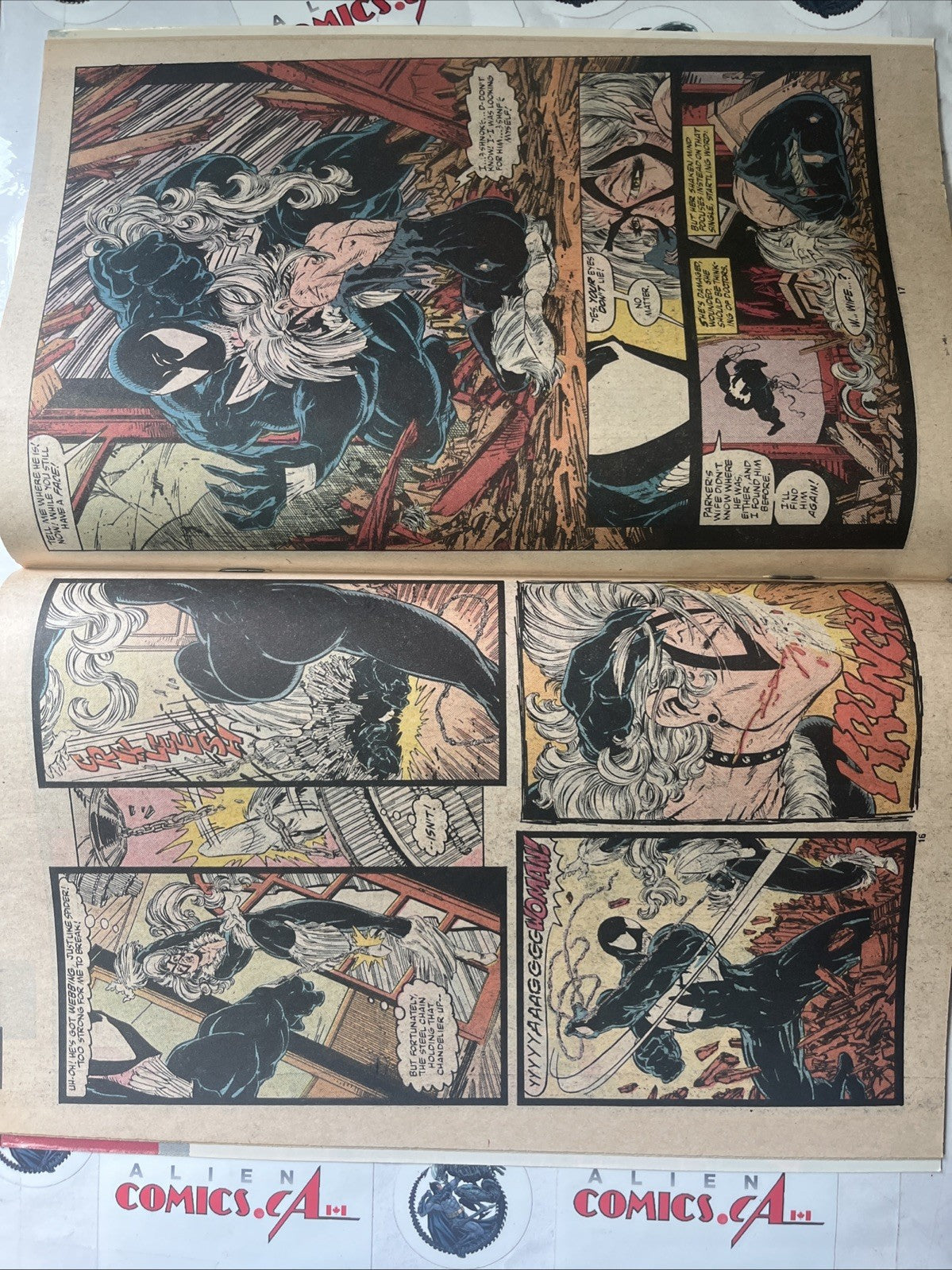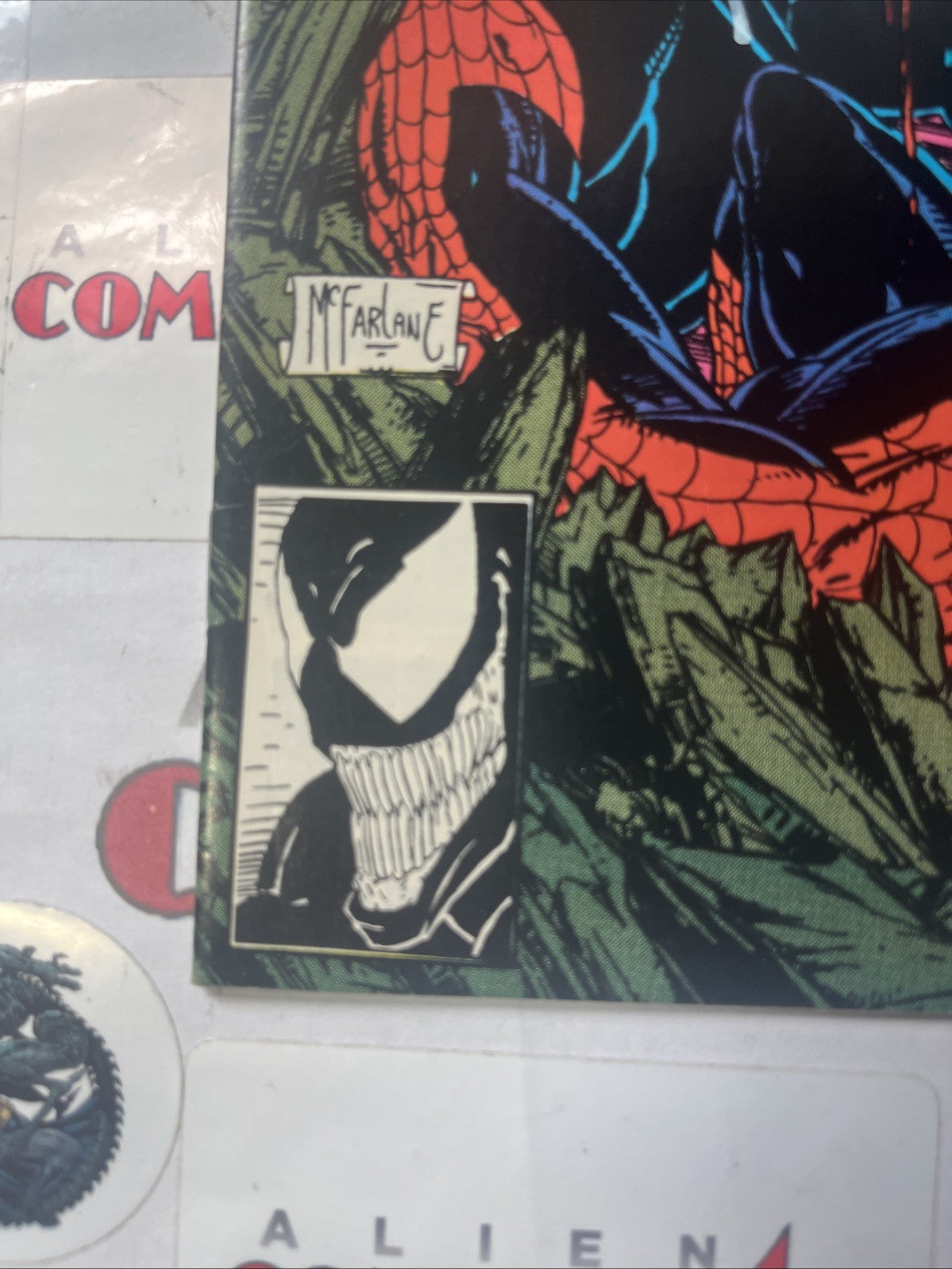 Direct Edition. "Dead Meat" Part 1 of 2. Script by David Michelinie. Art by Todd McFarlane. Cover by Todd McFarlane. Venom is back in New York City! And the deranged Eddie Brock is looking to kill Peter Parker or Spider-Man with extreme prejudice! However first the psychotic symbiote has to find where the Parkers are living! At the web-slinger's former Bedford Towers residence, Venom runs into and then runs roughshod over the Black Cat! But Felicia doesn't know where the wall-crawler is either! Later on Peter learns that his worst nightmare has returned and his family is in grave danger. Spider-Man can't wait for Venom to make the first move. The web-slinger must attack! Cameo appearances by Aunt May, Glory Grant, and Eduardo Lobo. (Note: This two-part story was reprinted in 1990 in the trade paperback: Spider-Man vs. Venom.) 32 pages. Cover price $1.00.