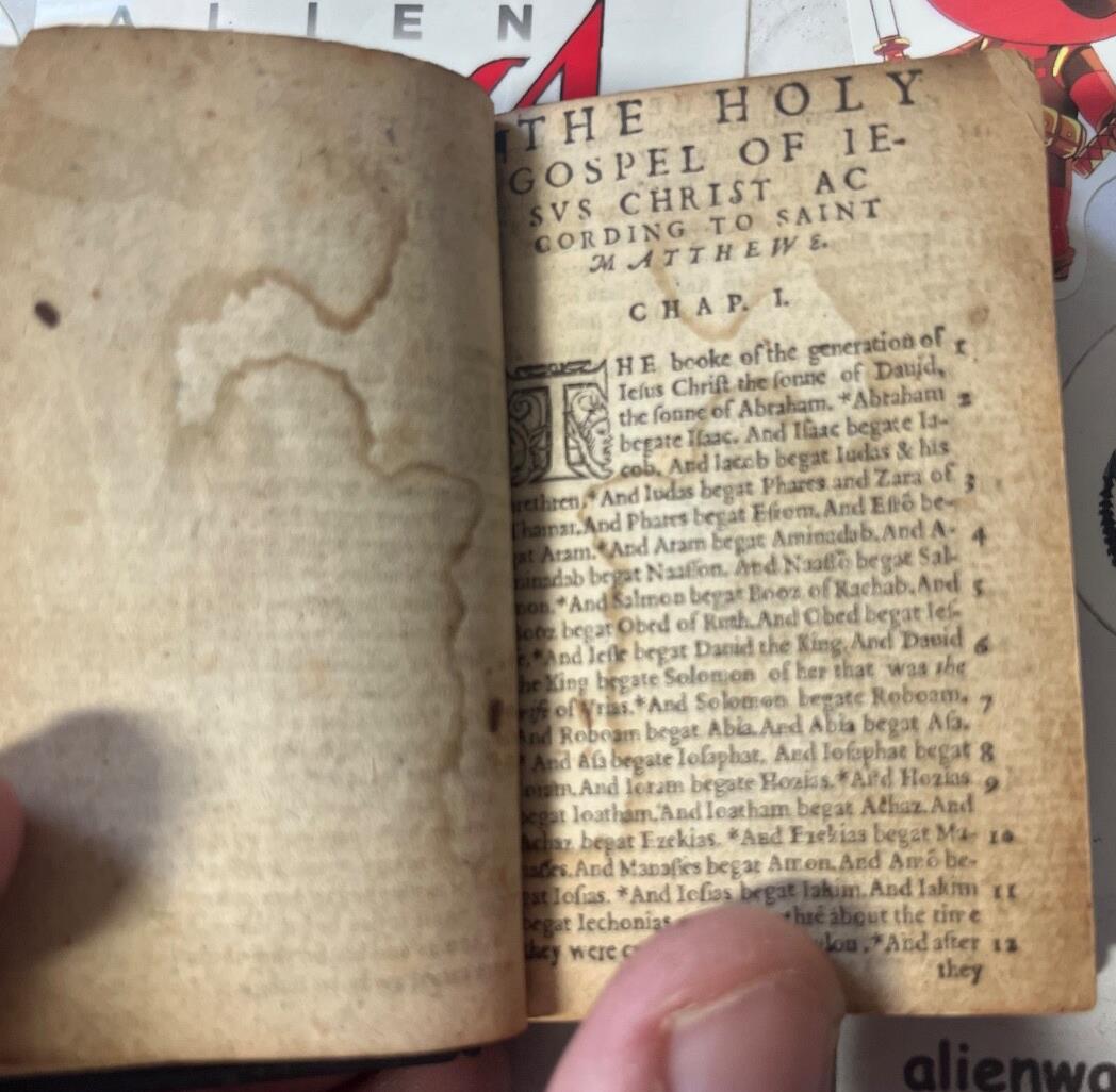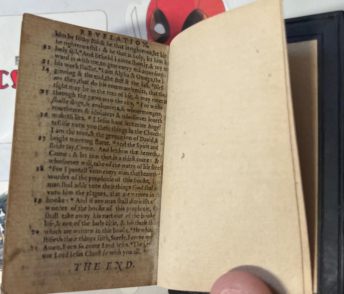 This miniature book is 433 years young and is the second edition of the King James Bible of our Lord Jesus Christ.  Faithfully translated from Greek and Hebrew to English.  This book is complete, leather-bound and an ancient collectable for Christians and non-christian collectors alike.  Original auction receipt included with purchase for authenticity and historical record keeping.