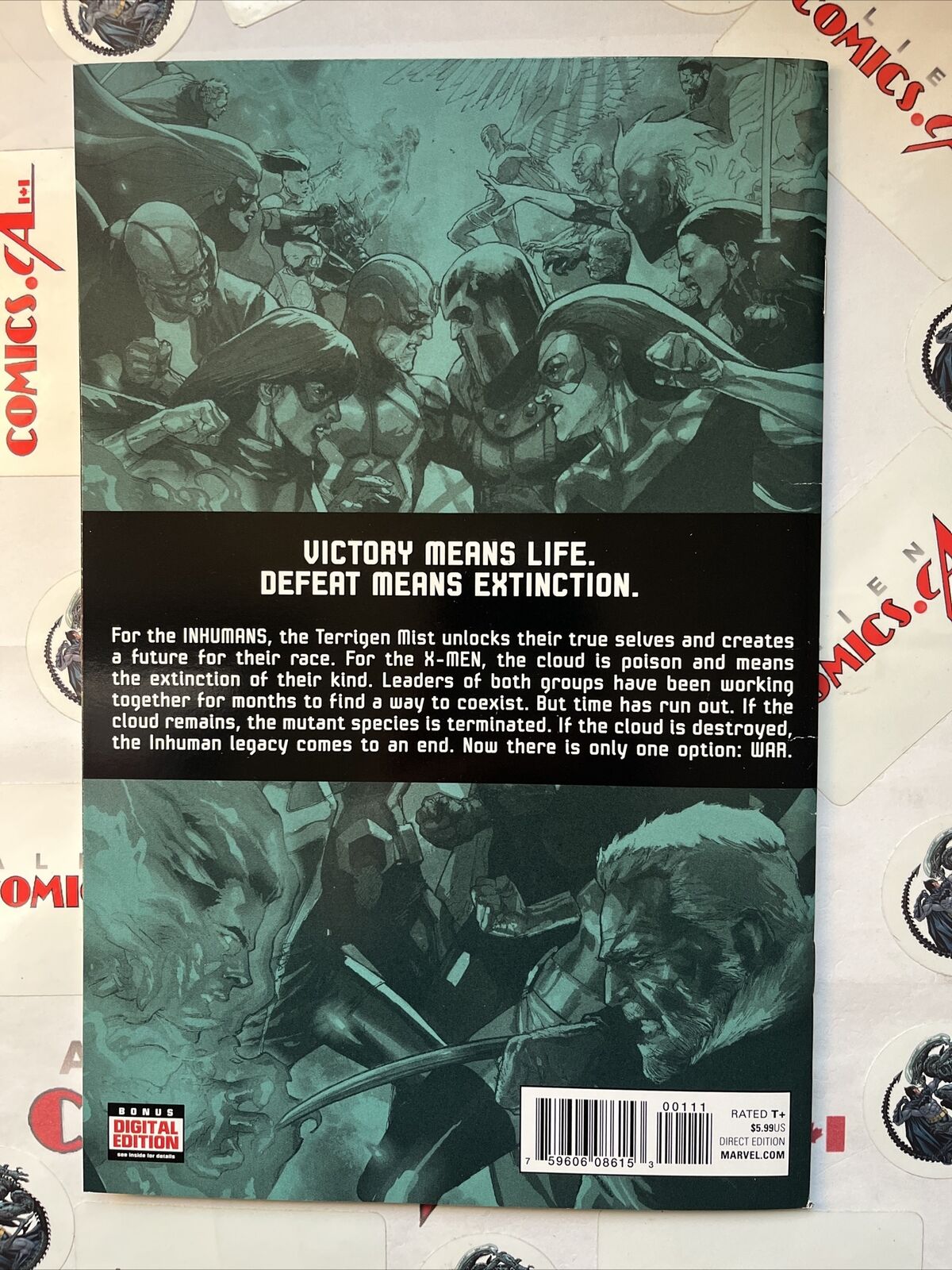The X-Men and Inhumans have been on a collision course ever since the link was proven between the Inhumans' precious Terrigen Mist and the sickness and death of many mutants. And when the Beast discovers that mutants have only two weeks left before Earth becomes uninhabitable for them, an Inhuman/mutant war is unavoidable! It all begins with one choice, and the world will never be the same! As New Attilan comes under attack, the Inhumans won't surrender without a fight - but when the X-Men target the Terrigen cloud, will that mean the end of the line for the entire Inhuman legacy?