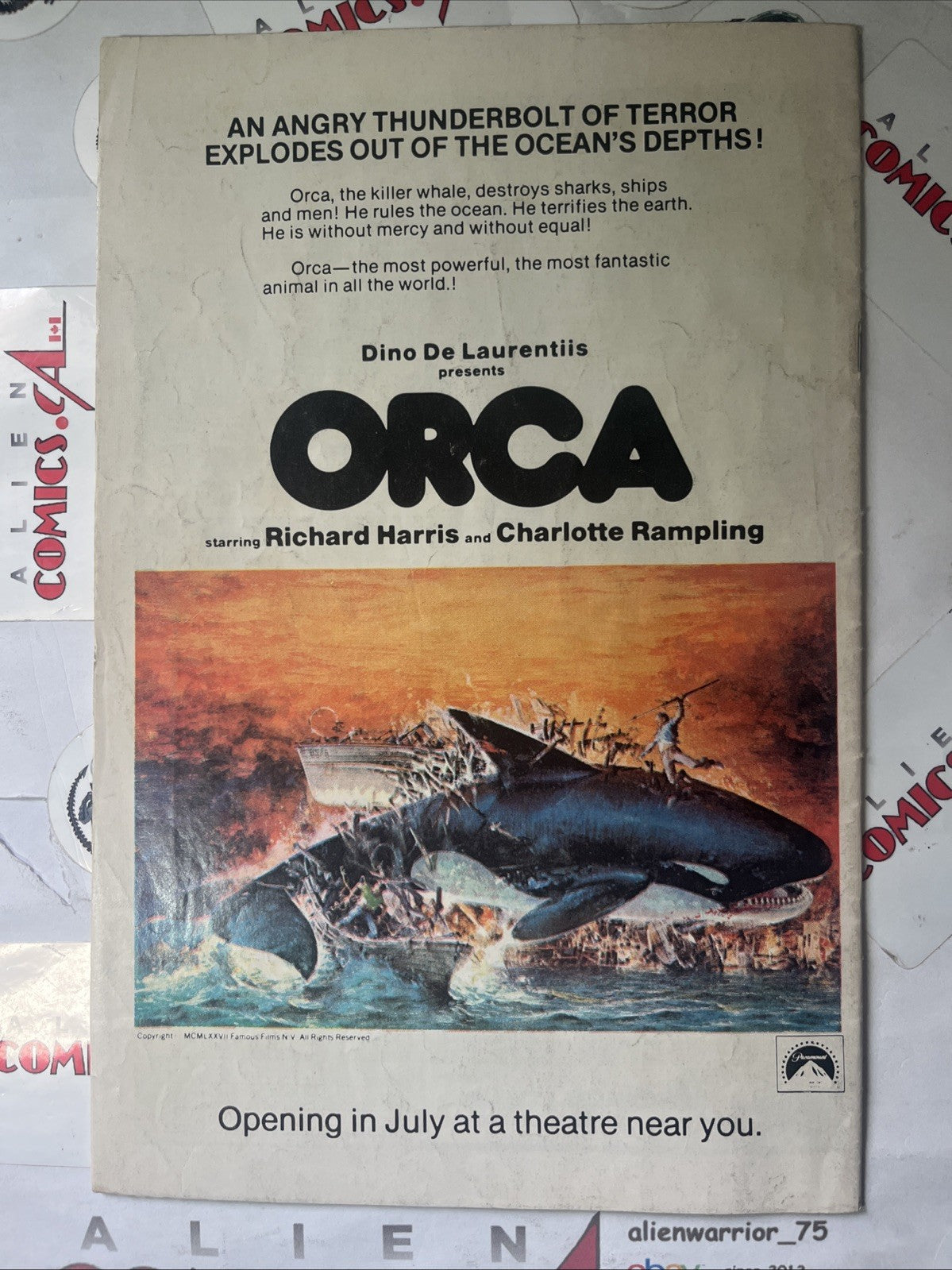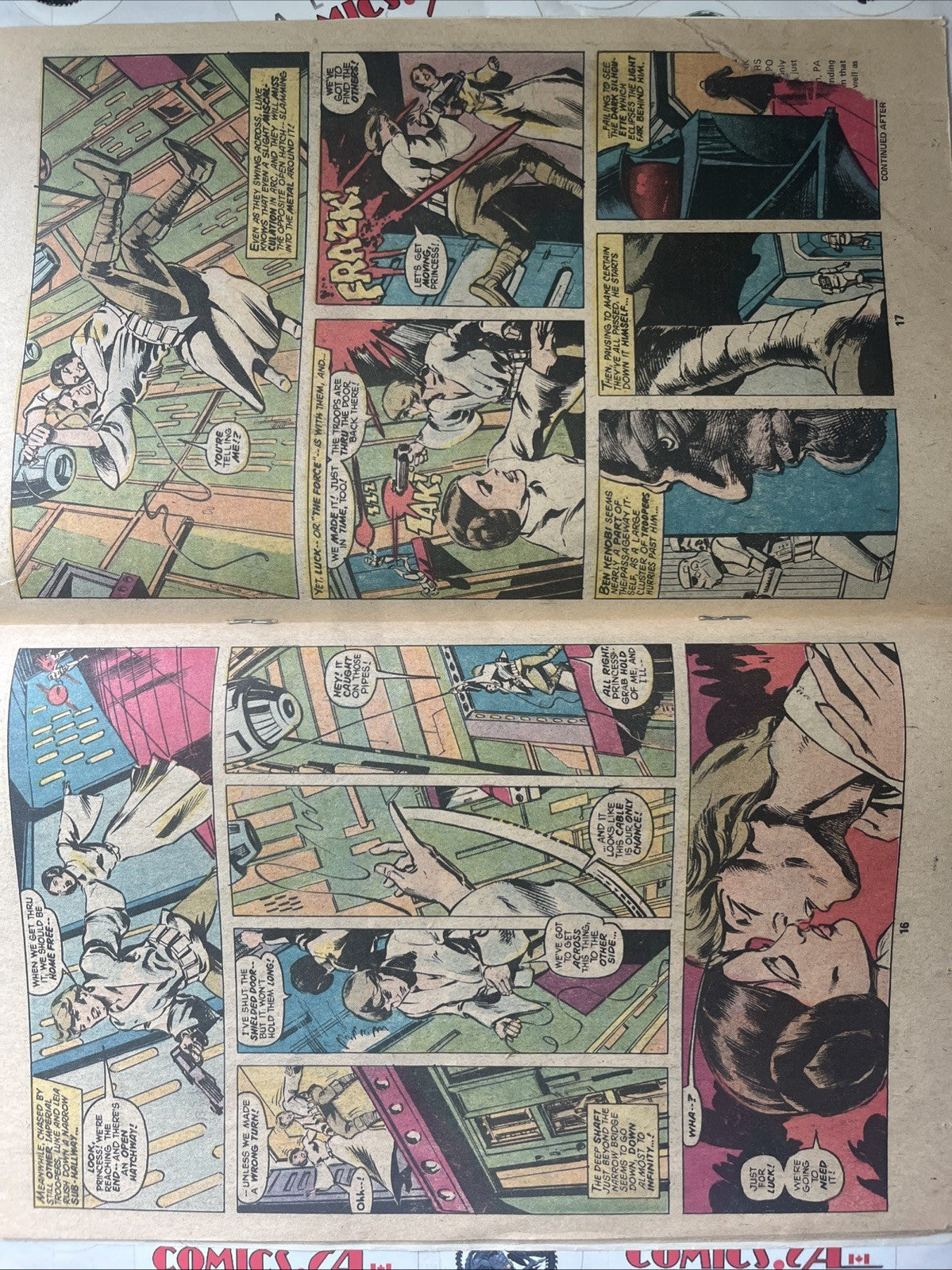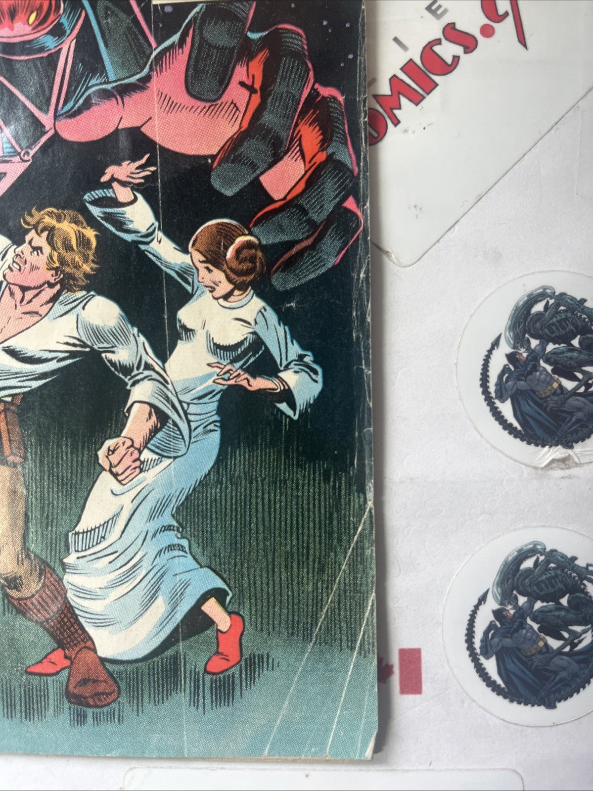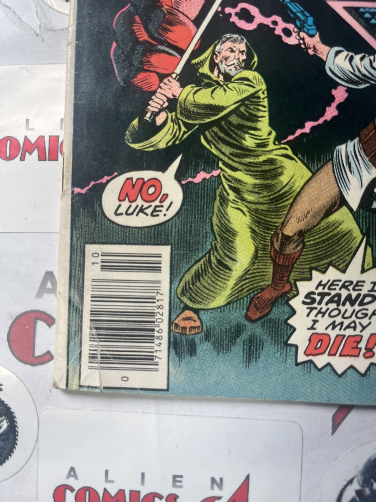 1st printing, Rare 35 Cent Newsstand Edition with UPC. A New Hope: Part 4 of 6. "In Battle with Darth Vader!" Based on the screenplay by George Lucas. Adapted by Roy Thomas. Art by Howard Chaykin and Steve Leialoha. While Luke, Han, Leia, and the rest try desperately to escape the confines of the Death Star, Ben Kenobi stands face-to-face with the deadliest Sith Lord the Dark Side has ever produced, Darth Vader! As the two bitter enemies duel to a stalemate with lightsabres, the old jedi soon realizes that for Luke, and the galaxy for that matter, to go on, he may have to make the ultimate sacrifice. Cover price $0.35.