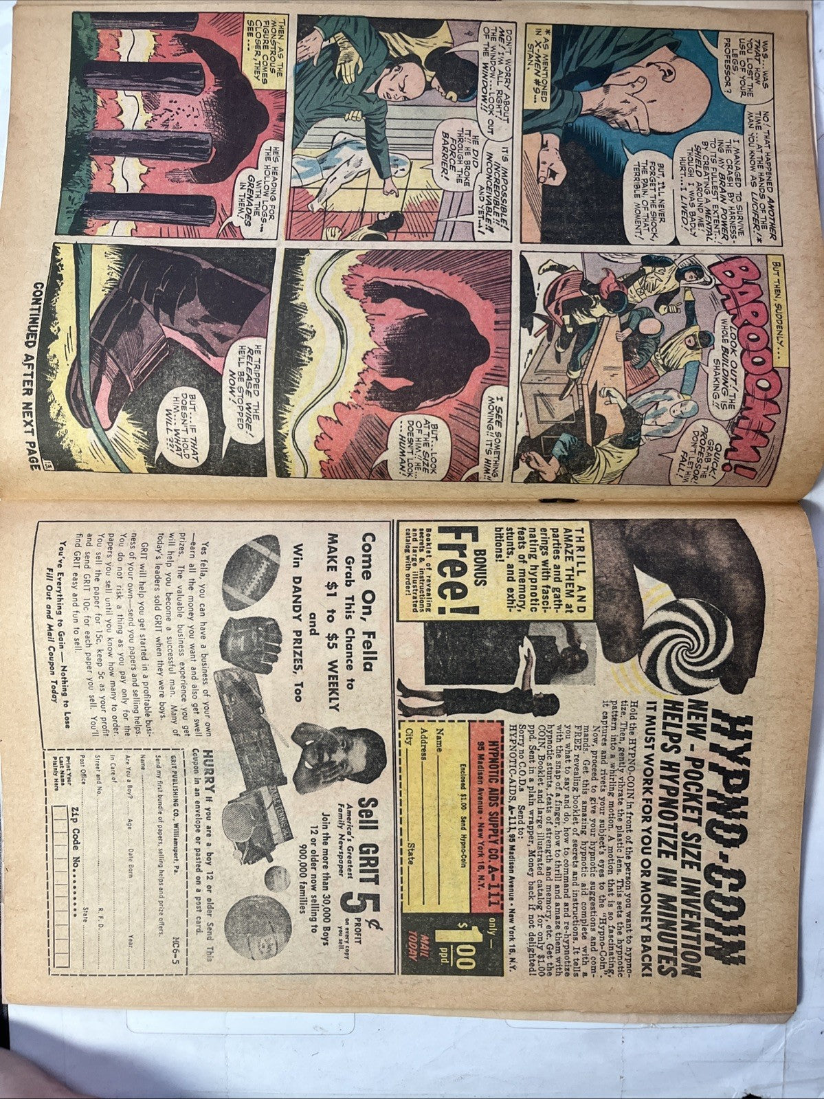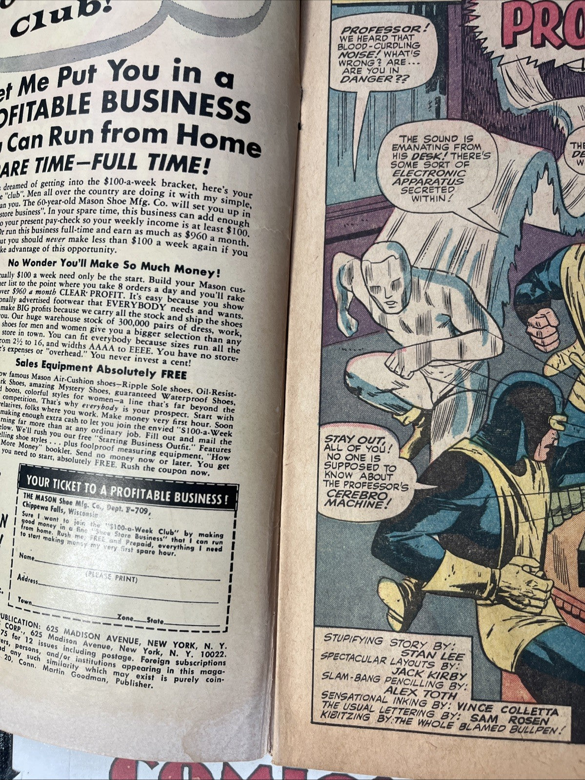 Cover pencils by Jack Kirby, inks by Frank Giacoia. The Origin of Professor X!, script by Stan Lee, pencils by Jack Kirby (layouts) and Alex Toth (pencils), inks by Vince Colletta; Cerebro detects a powerful mutant and Xavier fears that he knows who it is; The X-Men prepare the mansion for an all out assault; As the mysterious villain batters his way through the mansion's defenses, Professor X tells his students his origin story and how his step-brother changed from tormenting bully to an unstoppable Juggernaut; 1st appearance of the Juggernaut. 36 pgs. $0.12. Cover price $0.12.